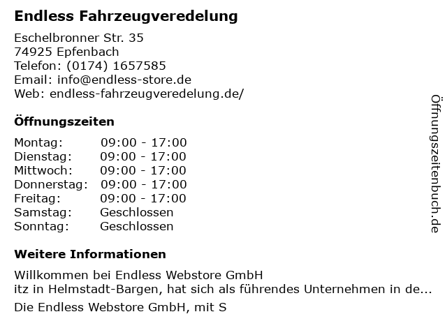 | Öffnungszeiten Endless Fahrzeugveredelung in Epfenbach anzeigen | |