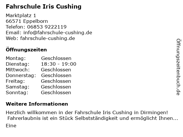 | Öffnungszeiten Fahrschule Iris Cushing in Eppelborn anzeigen | |