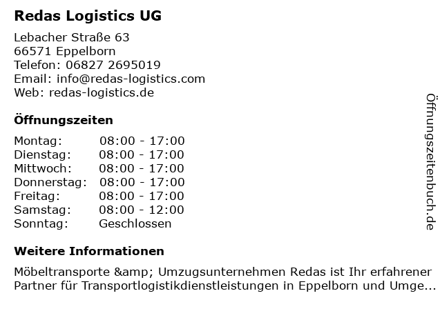 | Öffnungszeiten Redas Logistics UG in Eppelborn anzeigen | |