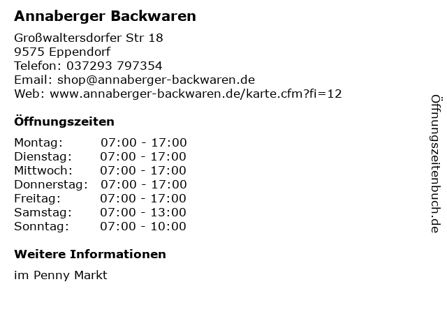 | Öffnungszeiten Annaberger Backwaren in Eppendorf anzeigen | |