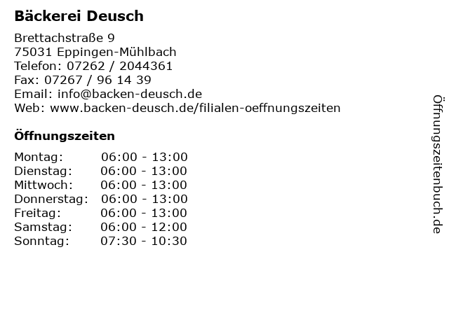 | Öffnungszeiten Bäckerei Deusch in Eppingen-Mühlbach anzeigen | |