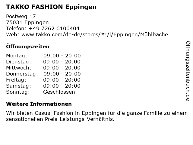 | Öffnungszeiten TAKKO FASHION Eppingen in Eppingen anzeigen | |
