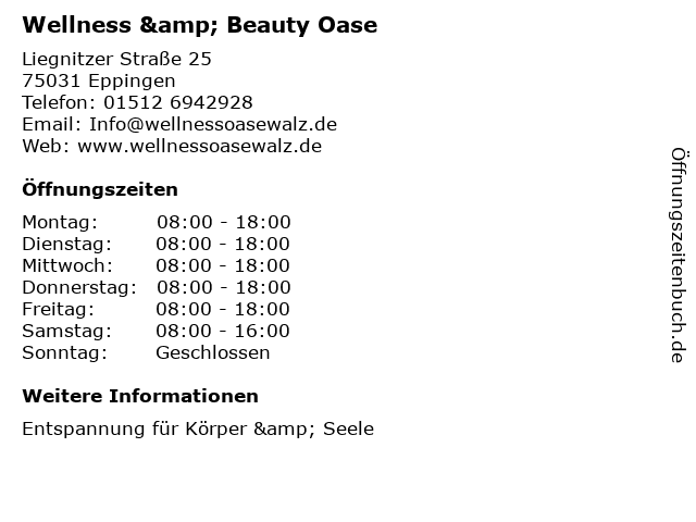 | Öffnungszeiten Wellness & Beauty Oase in Eppingen anzeigen | |