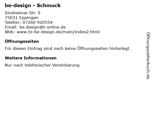| Öffnungszeiten be-design - Schmuck in Eppingen anzeigen | |