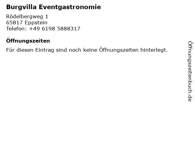 | Öffnungszeiten Burgvilla Eventgastronomie in Eppstein anzeigen | |