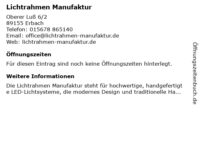 | Öffnungszeiten Lichtrahmen Manufaktur in Erbach anzeigen | |