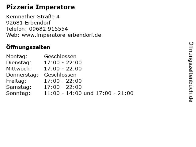 | Öffnungszeiten Pizzeria Imperatore in Erbendorf anzeigen | |