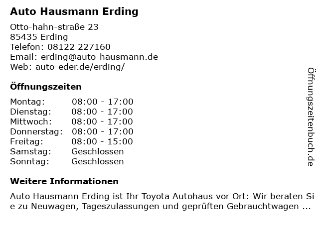 | Öffnungszeiten Auto Hausmann Erding in Erding anzeigen | |