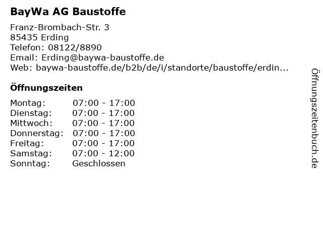 | Öffnungszeiten BayWa AG Baustoffe in Erding anzeigen | |