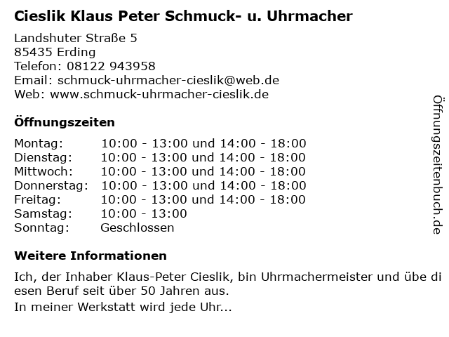 Branchen & Suchbegriffe zu Cieslik Klaus Peter Schmuck- u. Uhrmacher:cieslik, klaus, peter, schmuck, u., uhrmacher |