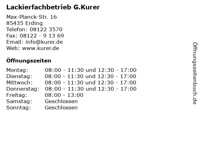 | Öffnungszeiten Lackierfachbetrieb G.Kurer in Erding anzeigen | |