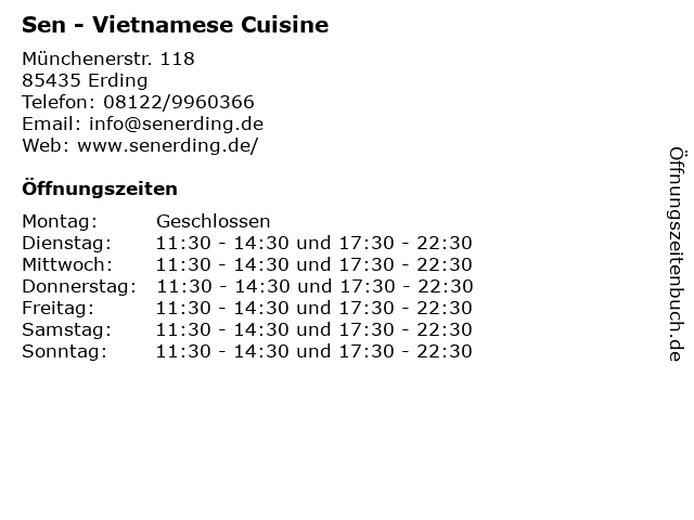 | Öffnungszeiten Sen - Vietnamese Cuisine in Erding anzeigen | |