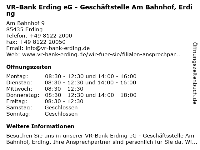 3 VR-Bank Erding eG - SB-Standort Bräuhausgasse-Erding (Entfernung: 0,46 km) Bräuhausgasse 2, 85435 Erding 4 VR-Bank Erding eG - Geschäftsstelle Klettham (Entfernung: 0,81 km) Thomas-Wimmer-Str. 33, 85435 Erding 5 VR-Bank Erding eG - (Geldautomat Geschäftsstelle) (Entfernung: 0,81 km) Thomas-Wimmer-Str. 33, 85435 Klettham 6 |