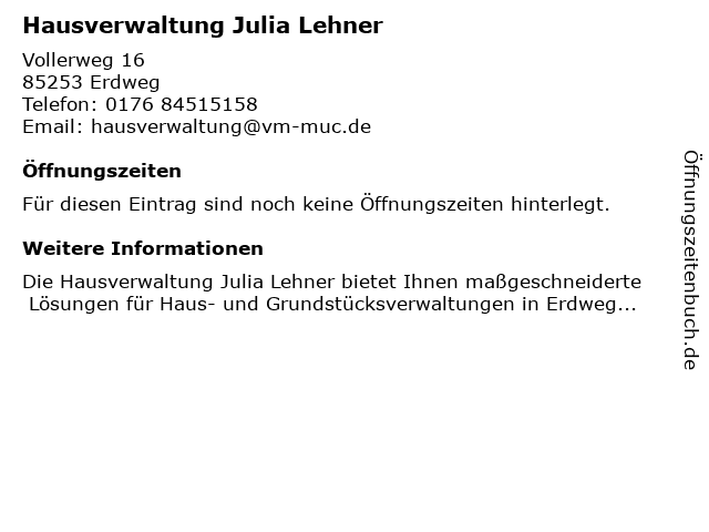 | Öffnungszeiten Hausverwaltung Julia Lehner in Erdweg anzeigen | |