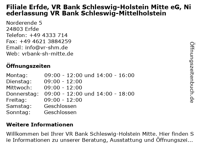 Branchen & Suchbegriffe zu Filiale Erfde, VR Bank Schleswig-Holstein Mitte eG, Niederlassung VR Bank Schleswig-Mittelholstein:bank, eg, erfde, holstein, mitte, mittelholstein, niederlassung, vr |