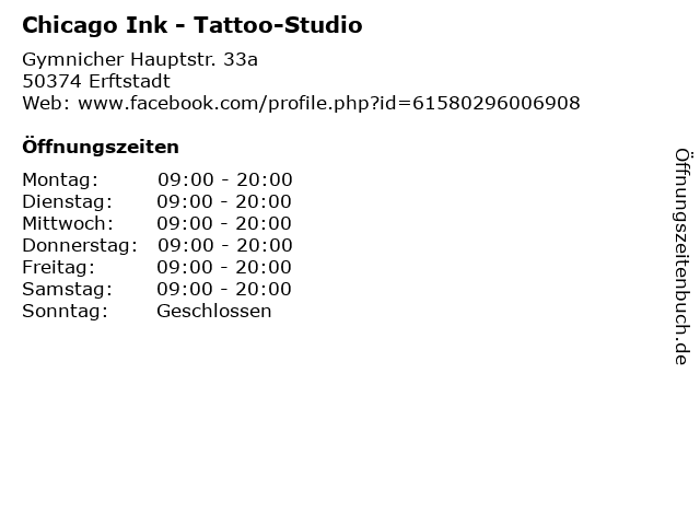 | Öffnungszeiten Chicago Ink - Tattoo-Studio in Erftstadt anzeigen | |