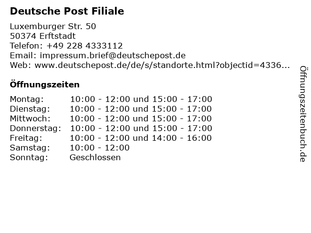 | Öffnungszeiten Deutsche Post Filiale in Erftstadt anzeigen | |