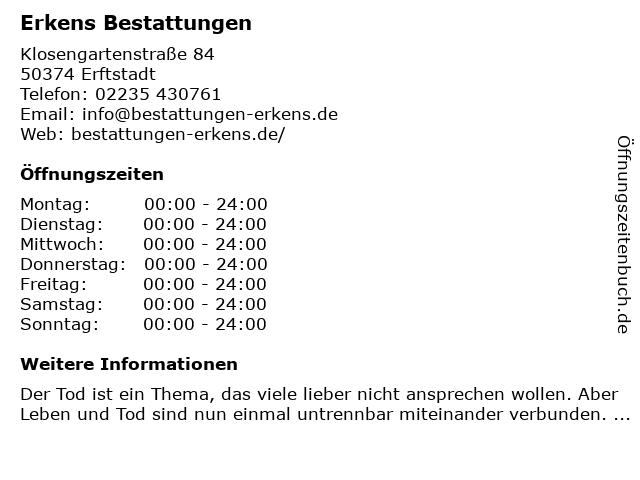| Öffnungszeiten Erkens Bestattungen in Erftstadt anzeigen | |