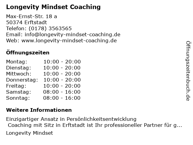 | Öffnungszeiten Longevity Mindset Coaching in Erftstadt anzeigen | |