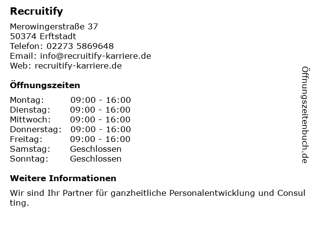 | Öffnungszeiten Recruitify in Erftstadt anzeigen | |