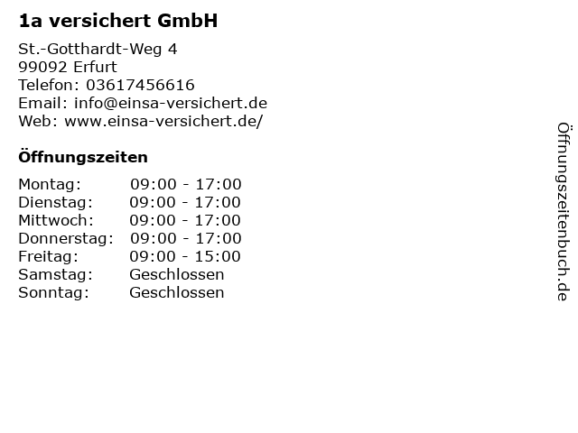 | Öffnungszeiten 1a versichert GmbH in Erfurt anzeigen | |