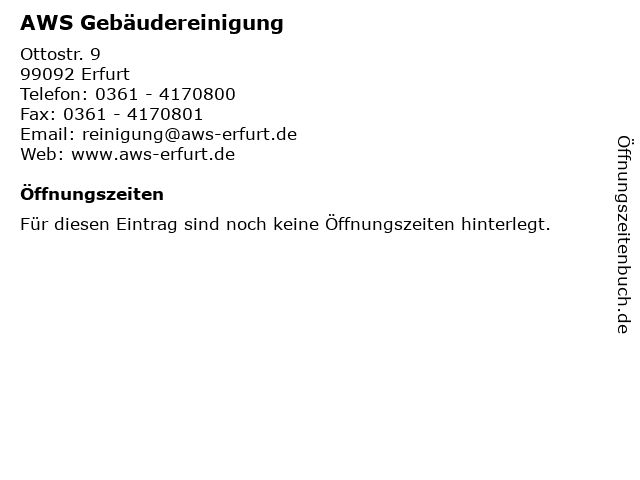 | Öffnungszeiten AWS Gebäudereinigung in Erfurt anzeigen | |