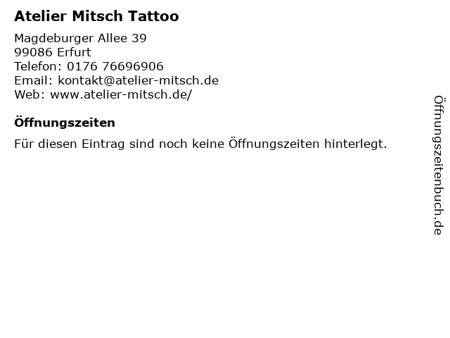 | Öffnungszeiten Atelier Mitsch Tattoo in Erfurt anzeigen | |