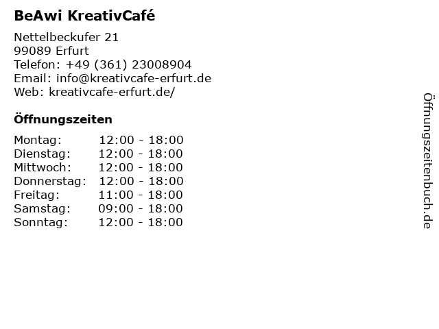 | Öffnungszeiten BeAwi KreativCafé in Erfurt anzeigen | |