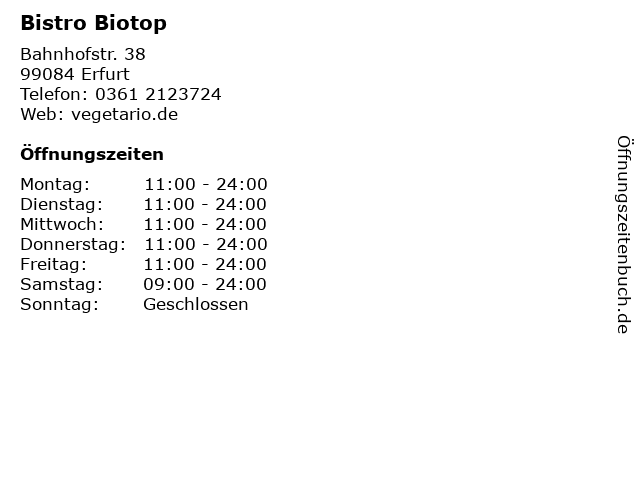 | Öffnungszeiten Bistro Biotop in Erfurt anzeigen | |