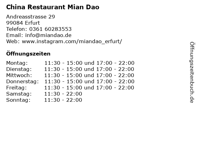 | Öffnungszeiten China Restaurant Mian Dao in Erfurt anzeigen | |