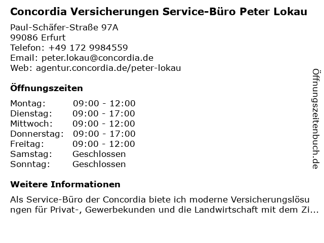 Branchen & Suchbegriffe zu Concordia Versicherungen Service-Büro Peter Lokau:büro, concordia, lokau, peter, privathaftpflicht, service, versicherungen, versicherungsagentur erfurt |