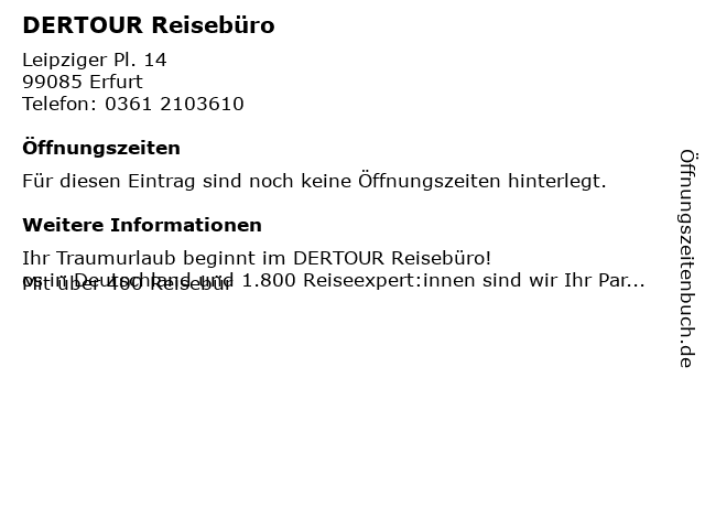 Öffnungszeiten DERTOUR Reisebüro in Erfurt anzeigen | |