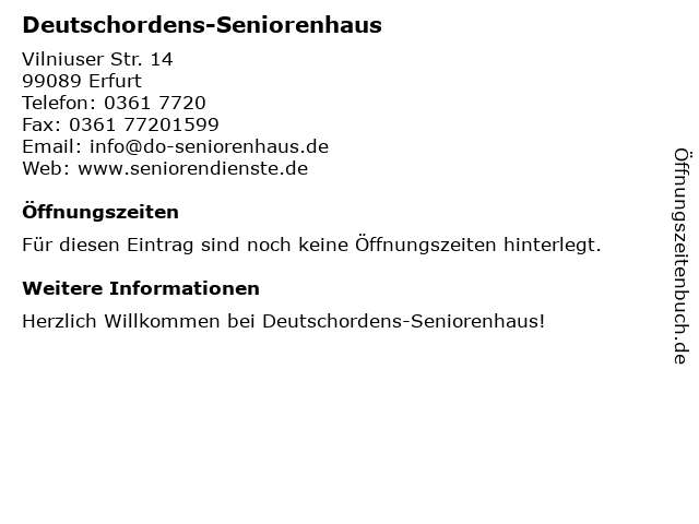 | Öffnungszeiten Deutschordens-Seniorenhaus in Erfurt anzeigen | |