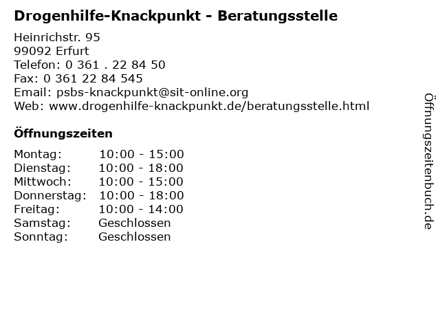 2 SiT - Beratungszentrum für Glücksspielsucht in Erfurt (Entfernung: 2,29 km) Liebknechtstraße 19, 99085 Erfurt 4 SiT-Suchthilfe in Thüringen gGmbH - Beratungsstelle Sömmerda (Entfernung: 22,15 km) Am Rothenbach 45, 99610 Sömmerda 6 Suchtberatungsstelle PSBSS.i.T. Suchthilfe in Thüringen gGmbH (Entfernung: 22,19 km) Adolf-Barth-Str. 25, 99610 Sömmerda |