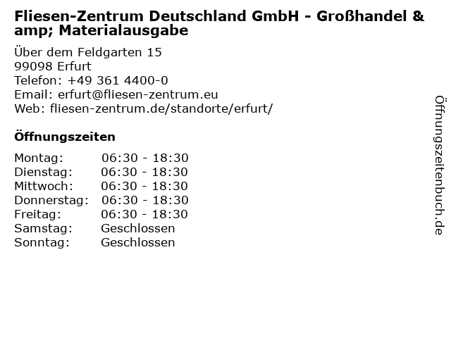 1 Fliesen-Zentrum Deutschland - Ausstellungsraum (Entfernung: 0,01 km) Über dem Feldgarten 15, 99198 Erfurt 3 Käppler GmbH Wartungsdienst u. Fachmarkt Sanitär Heizung Fliesen Elektro Klempnerarbeiten (Entfernung: 4,81 km) Andreasstr. 1, 99084 Erfurt 5 Christian Thein Fliesen- & Natursteinverlegung (Entfernung: 10,13 km) Am Rosenborn 12, 99100 Salomonsborn 6 |
