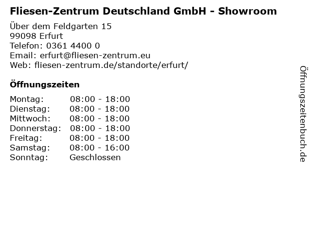 1 Fliesen-Zentrum Deutschland GmbH - Großhandel & Materialausgabe (Entfernung: 0,29 km) Über dem Feldgarten 15, 99098 Erfurt 2 Fliesen-Zentrum Deutschland - Ausstellungsraum (Entfernung: 0,30 km) Über dem Feldgarten 15, 99198 Erfurt 5 Käppler GmbH Wartungsdienst u. Fachmarkt Sanitär Heizung Fliesen Elektro Klempnerarbeiten (Entfernung: 4,97 km) Andreasstr. 1, 99084 Erfurt 6 |