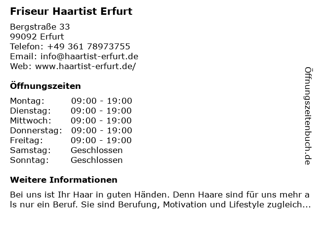 | Öffnungszeiten Friseur Haartist Erfurt in Erfurt anzeigen | |