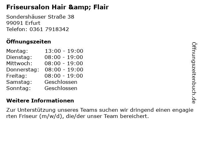 | Öffnungszeiten Friseursalon Hair & Flair in Erfurt anzeigen | |