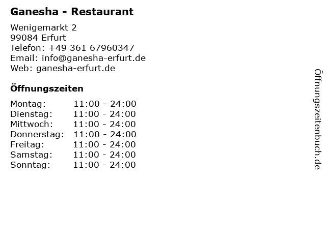 | Öffnungszeiten Ganesha - Restaurant in Erfurt anzeigen | |