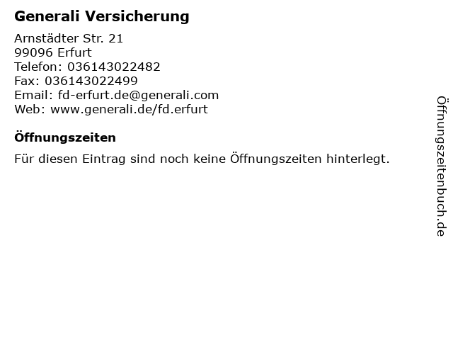 | Öffnungszeiten Generali Versicherung in Erfurt anzeigen | |