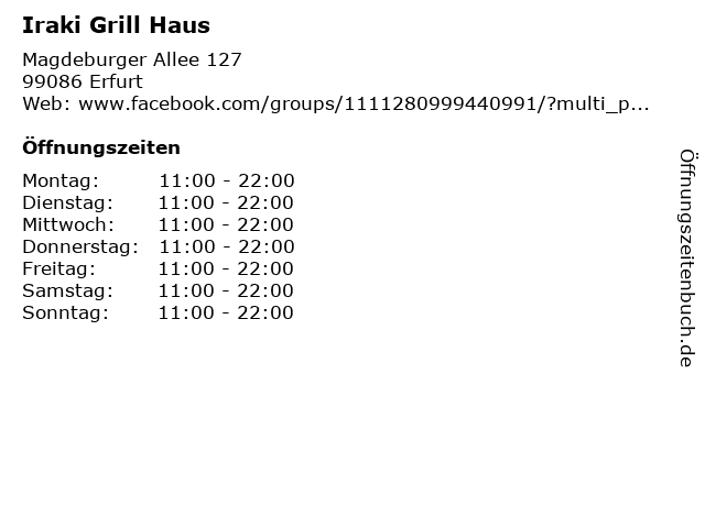 | Öffnungszeiten Iraki Grill Haus in Erfurt anzeigen | |