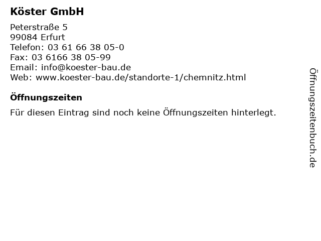 | Öffnungszeiten Köster GmbH in Erfurt anzeigen | |