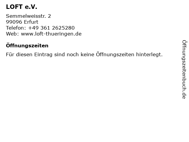 | Öffnungszeiten LOFT e.V. in Erfurt anzeigen | |