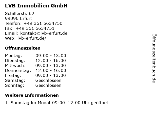 | Öffnungszeiten LVB Immobilien GmbH in Erfurt anzeigen | |