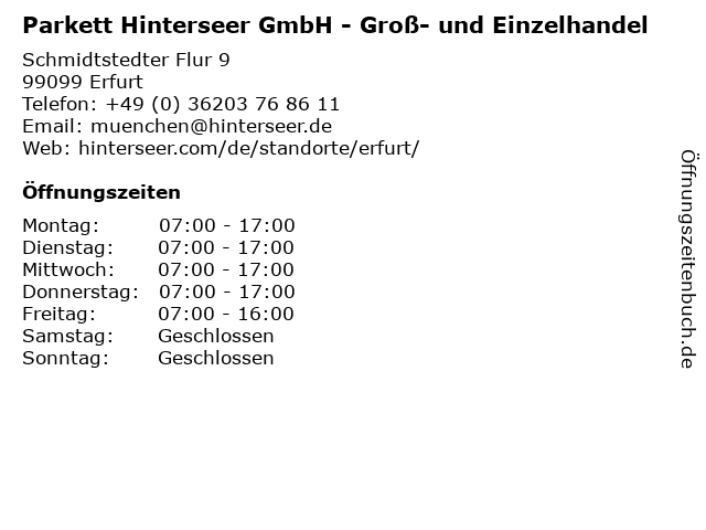 1 Parkett Hinterseer GmbH - Beratung im Parkettstudio (Entfernung: 0,00 km) Schmidtstedter Flur 9, 99099 Erfurt 6 |