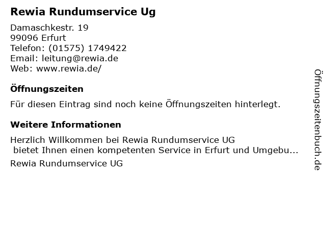 | Öffnungszeiten Rewia Rundumservice Ug in Erfurt anzeigen | |