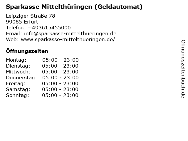 1 Sparkasse Mittelthüringen (Geldautomat) (Entfernung: 2,79 km) Friedrich-Ebert-Straße 63, 99096 Erfurt 4 5 Sparkasse Mittelthüringen (Geldautomat) (Entfernung: 7,31 km) Erfurter Landstraße 9/10, 99095 Stotternheim 6 |