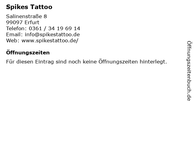 | Öffnungszeiten Spikes Tattoo in Erfurt anzeigen | |