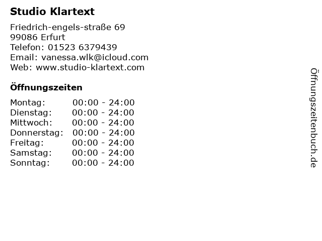 | Öffnungszeiten Studio Klartext in Erfurt anzeigen | |