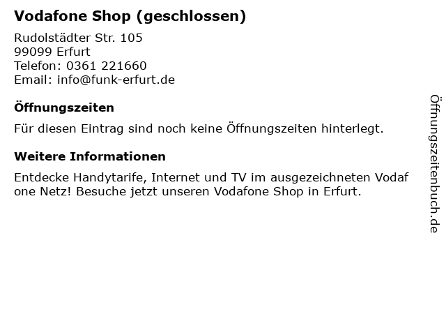 | Öffnungszeiten Vodafone Shop (geschlossen) in Erfurt anzeigen | |